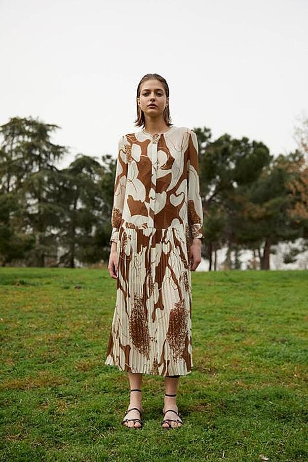 Con un diseño más liviano y de inspiración retro, este vestido estampado midi con cuello caja tiene corte camisero y manga larga. Además de la cintura baja, la falda está rematada con plisados, lo que le aporta mucho movimiento al conjunto. Está disponible en talla S y M y cuesta 39,99 euros.