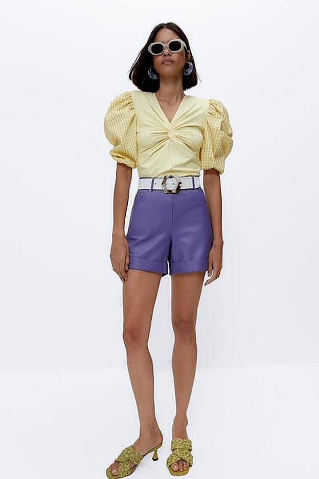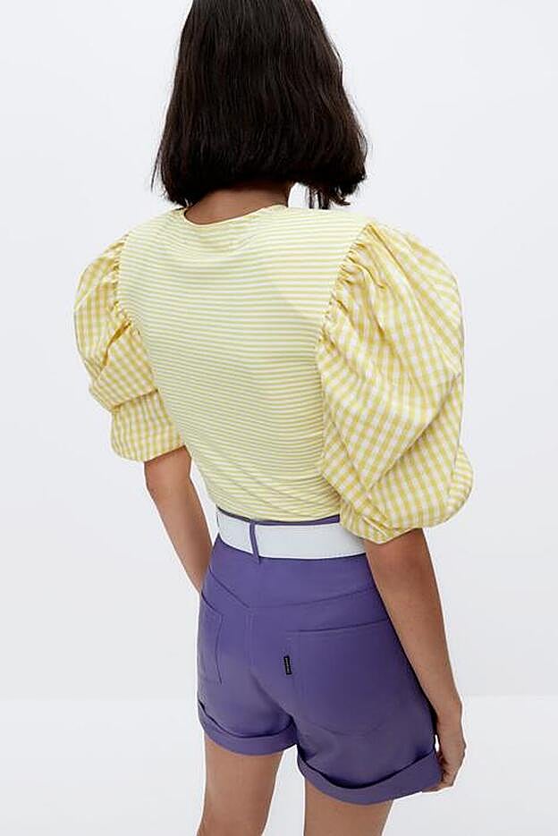 El estampado de cuadros, tipo Vichy, está en las mangas abullonadas con hombreras, acabadas en goma y confeccionadas en tejido popelín.