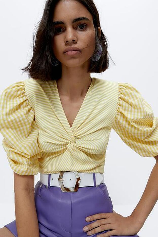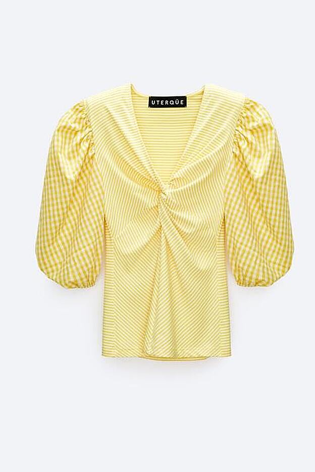Esta bonita camiseta de mangas abullonadas de Uterqüe tiene un precio de 69 euros y está disponible en las tallas S y M.