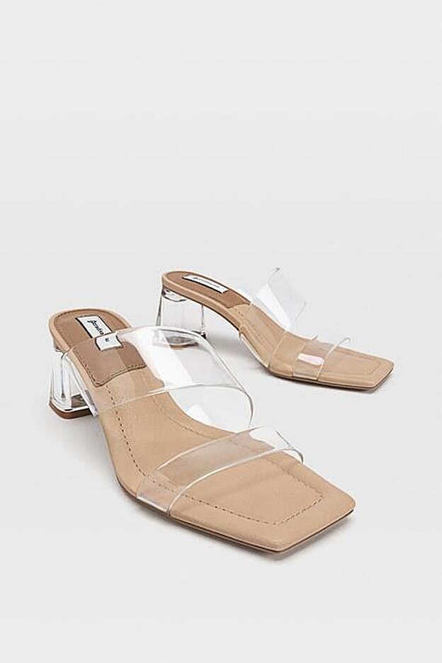 Desde la marca más juvenil de Inditex nos proponen combinarlas con unas sandalias que se pueden convertir en la sensación de la temporada. Con vinilo transparente en las tiras delanteras y tacón ancho de metacrilato de 6,5 centímetros, este calzado no sólo queda ideal con este vestido, sino también con faldas o vaqueros. Todavía están disponibles en todos los números por 29,99 euros.