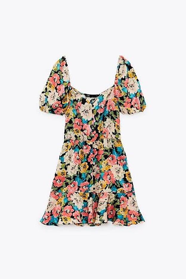 Se trata de un vestido de largo mini con escote en pico y manga corta abullonada que tiene un llamativo estampado floral como protagonista. Es en tonos azules. amarillos y rosas sobre un fondo negro, lleva el bajo acabado en volante y cuesta 29,95 euros. Y para nuestra suerte es una prenda que (todavía) está disponible en todas las tallas: desde la XS a la XL.