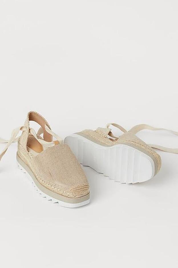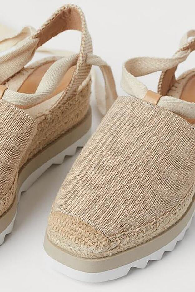 Son un modelo de H&M y está elaborada en diferentes tonos de beige, tanto el cuerpo del zapato como los lazos con los que te lo ajustas al tobillo. La diferencia de color entre la alpargata y la suela, que es blanca, hace que se realce el detalle más moderno y no pase desapercibida. Puedes combinarla con un look más arreglado gracias a su cuña de esparto y con modelos más deportivos, por su suela track.