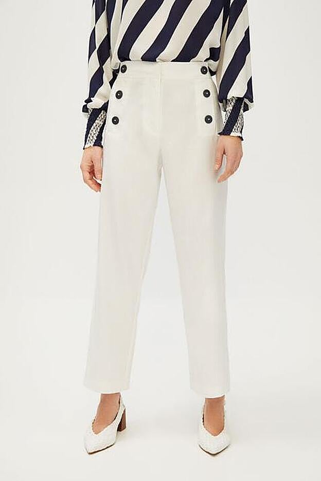 Si quieres llevar una versión elegante y arreglada como la de Carmen Lomana, en Cortefiel hemos dado con un pantalón blanco de corte recto con este tipo de botones marineros. Cuestan 59,99 euros y están disponibles en todas las tallas de la S a la XXL.
