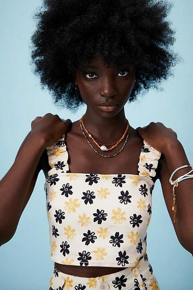 El top de diseño cropped es de escote recto y tirantes anchos fruncidos para crear cierto vuelo.