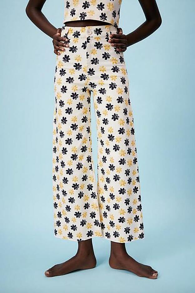 Con bajos deshilachados por encima del tobillo, este vaquero crudo con estampado con flores amarillas y negras cuesta 29,95 euros y podemos encontrarlo entre las tallas 32 y 44.