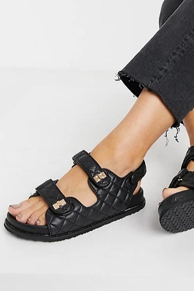 Sabemos que no son exactamente iguales, pero estas sandalias de Asos son la evolución perfecta de las de Chanel puesto que incorporan al original diseño, el tejido acolchado y de cuero sintético, tan de moda esta temporada. Y, para qué nos vamos a engañar, son mucho más baratas.
