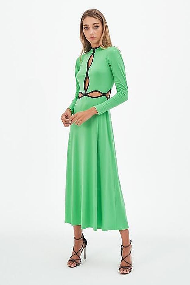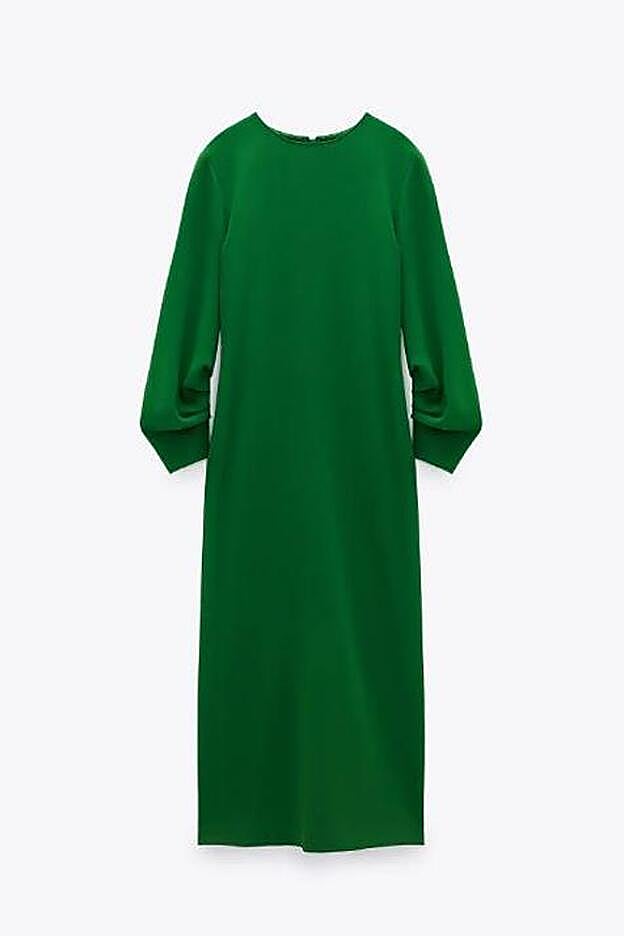 Desde la redacción hemos seleccionado este, de un verde más oscuro, pero con largo midi, cuello redondo y manga larga, que tiene un corte más recto y no lleva aberturas, por lo que es un modelo mucho más ponible para el día a día. Cuesta 39,95 euros y permite llevarlo con unas zapatillas blancas o con sandalias planas y conseguir así un look perfecto para el día a día.