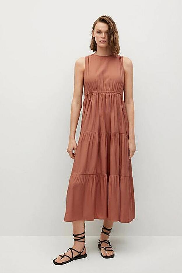 Nuestro favorito es este vestido fluido de volantes confeccionado en poliéster reciclado, con diseño acampanado largo, cuello redondo y detalle fruncido en la cintura en el frontal. Disponible en naranja, caqui y azul celeste, viene sin mangas y podemos comprarlo por 29,99 euros entre las tallas XS y XL.