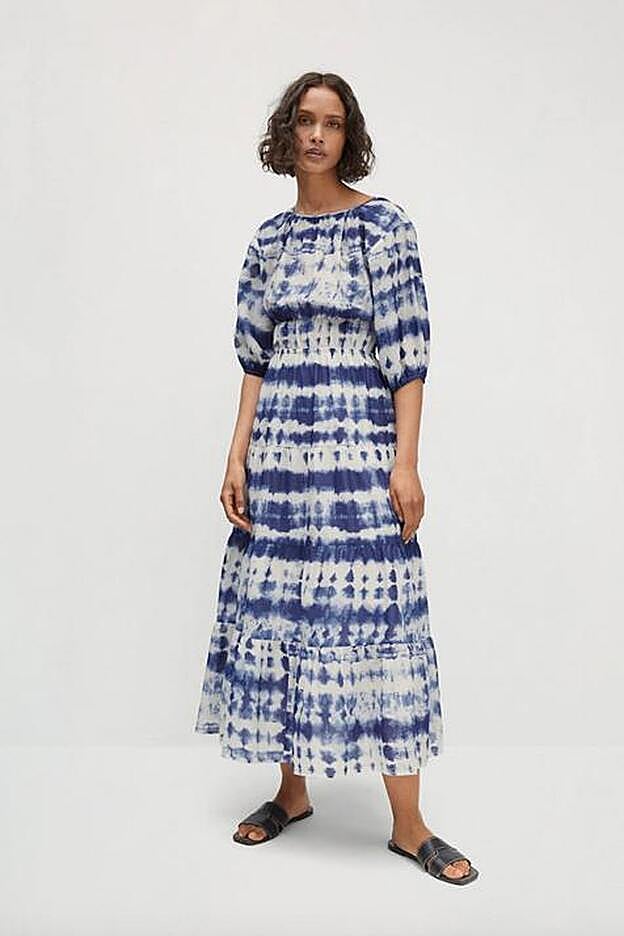 Y no podía faltar el estampado veraniego por excelencia, el tie-dye. En azul y blanco, confeccionado al 100% en algodón, viene con diseño largo acampanado, cuello redondo y cintura elástica. Con volante en el bajo y forro interior de algodón, está disponible entre las tallas XS y XL y cuesta 39,99 euros.