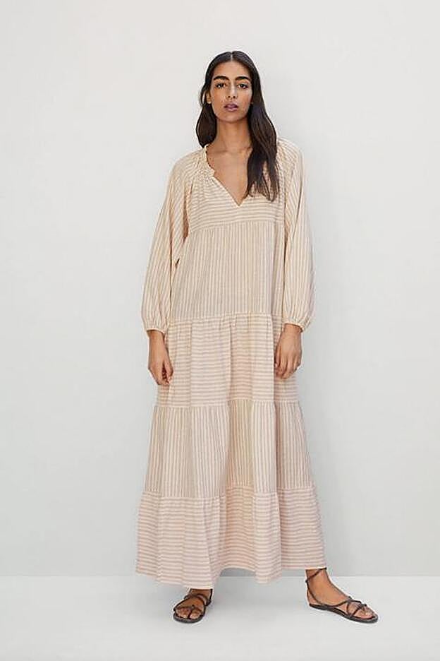 Otro de los vestidos largos más apetecibles de la firma es este en color crudo con rayas verticales y horizontales en varios tonos de rosa. Confeccionado en algodón y lino, de diseño maxi acampanado y escote de pico, viene con mangas largas con puños elásticos y volante en el bajo. Cuesta 49,99 euros y está disponible entre las tallas XS y XL.