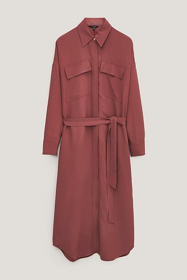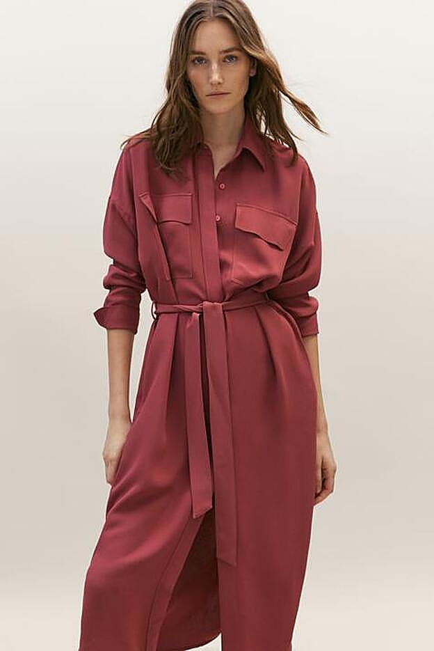 La diseñadora ha escogido un vestido camisero largo en color rosa oscuro, de corte evasé, cuello clásico, bolsillos delanteros con solapa, puños abotonados, bajo con aberturas laterales y un cinturón estilo lazada que podrás poner y quitar al gusto para un look más ceñido o uno más holgado, cómodo y relajado.
