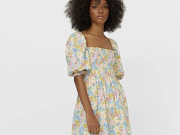 La segunda opción es un vestido corto con el escote recto y gomas en el corpiño. La manga también es abullonada, pero con un longitud ligeramente mayor a la del vestido anterior (aunque sin llegar a los tres cuartos). Tiene el mismo precio (25,99 €) y puedes encontrarlo en todas las tallas, de la XS a la XL.