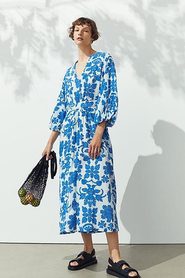 Hablamos de un vestido que H&M define como "caftán arrugado". Se trata de un modelo de corte midi con cuello elevado corto con abertura de pico, mangas globo tres cuartos y cinturón cosido con tiras de anudar detrás. Una prenda protagonizada por un bonito estampado floral en azul eléctrico sobre un fondo blanco, que también está disponible solo en blanco y que puedes comparar en la web de la firma por 34,99 euros.