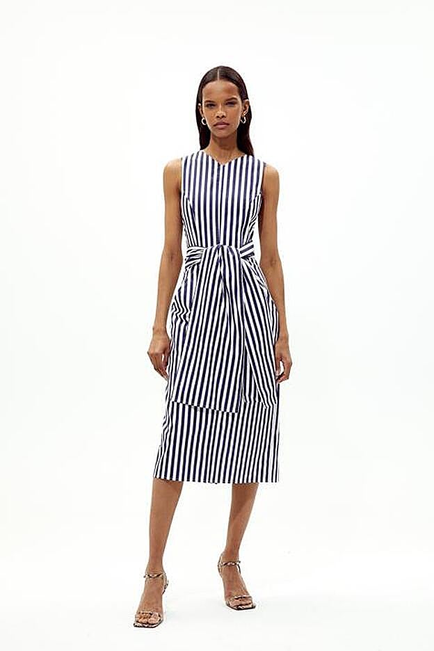 Seguro que has oído alguna vez que las rayas (aquí los vestidos más bonitos) no estilizan para nada (disclaimer: si quieres ponerte rayas, póntelas). Lo que sí es cierto es que el efecto óptico de las verticales afina la figura. Esto no quiere decir que vayas a digievolucionar al ponerte algo marinero, pero oye. Te sentará fenomenal, de eso estamos seguras. Prueba de ello es el vestido de rayas azules marino y blanco que hemos encontrado en Sfera. No solo es ideal y sirve para entretiempo y verano, si no que además es un súper chollo.