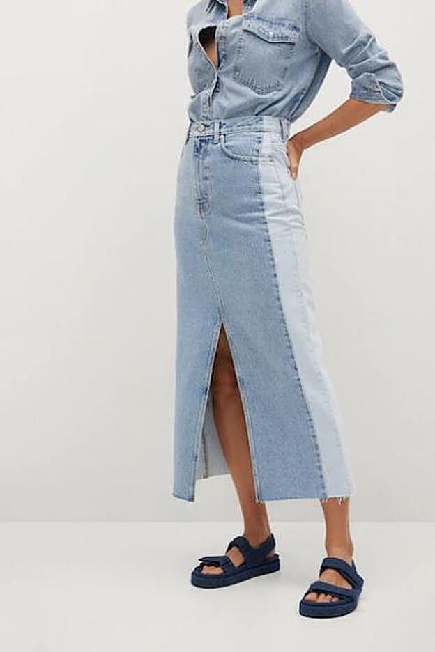Ideal, ¿verdad? Pues espera a ver como lo ha combinado Melissa. Ella escogió una de las prendas que más está pasando desapercibida esta temporada, pero que se lleva muchísimo y además favorece: la falda vaquera midi. En concreto, escogió un original modelo que tiene dos tonalidades de tejido vaquero y que cuesta 29,99 euros.