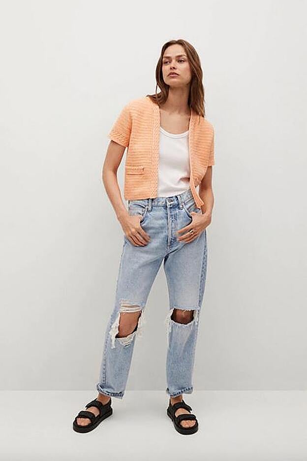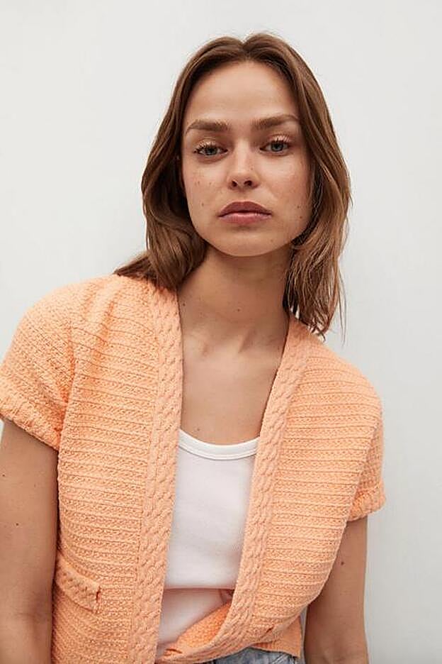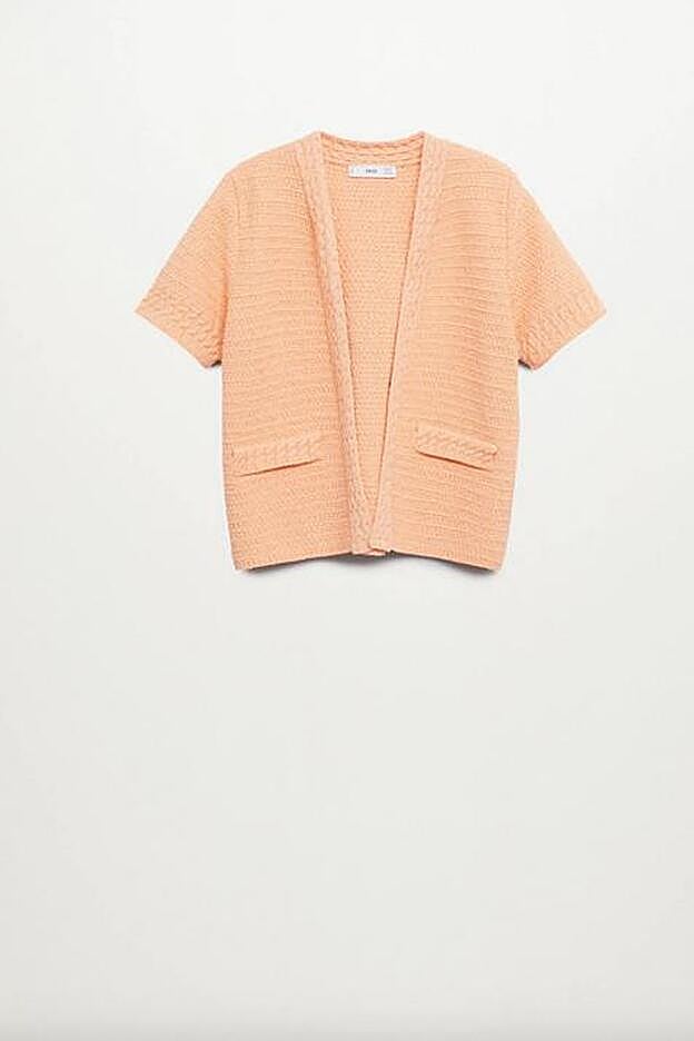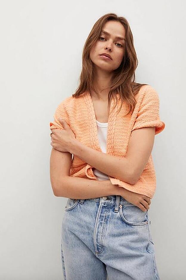 Confeccionado en punto de algodón en color pomelo, este cárdigan de Mango de diseño crop y cuello abierto es ideal para combinarlo con todos nuestros jeans. Pero también con tonos tan diferentes como el beige o el azul marino.