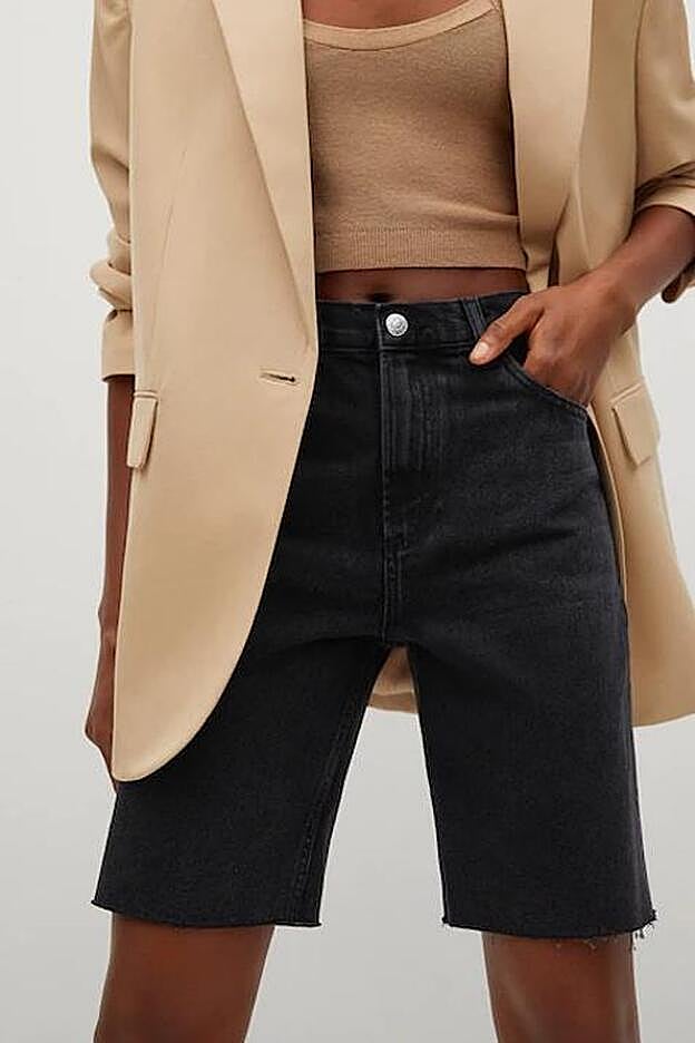 Tal y como podemos observar en el look, Grece ha llevado unas bermudas vaqueras en color negro de la nueva colección de Mango. Una prenda de tiro alto muy versátil que parece de lo más casual pero que si lo combinamos con una blazer y unos mocasines, crearemos un conjunto ideal para ir a la oficina super cómoda y con mucho estilo. Cuesta 25,99 euros y también está disponible en azul medio.