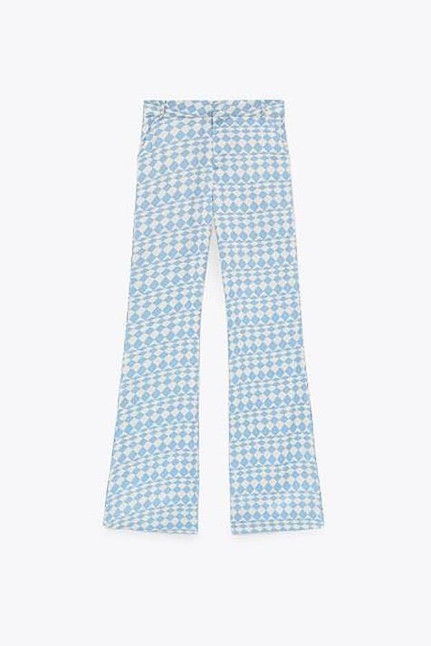 Hablamos de unos pantalones con un bonito estampado de rombos en color azul sobre un fondo beige. Es un modelo de la nueva colección de Zara caracterizado por una pernera ancha y larga, un corte fluido y talle alto. Cuestan 25,95 euros y están disponibles desde la talla XS a la XL.