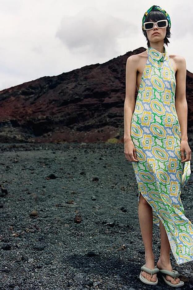 También en diseño midi la firma ha lanzado este vestido con cuello halter ajustable con lazada en la espalda. En blanco roto, azul, naranja y verde formando un psicodélico estampado de flores, está disponible entre las tallas XS y XL y cuesta 39,95 euros.