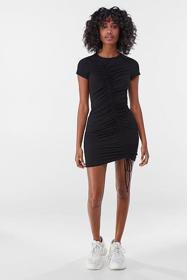 Se trata de un modelo súper barato (cuesta 15,99 euros) de manga corta, escote redondo y con el corto perfecto que nos ha enamorado no solo por su fruncido delantero que estiliza a más no poder, sino también porque pega con todo.