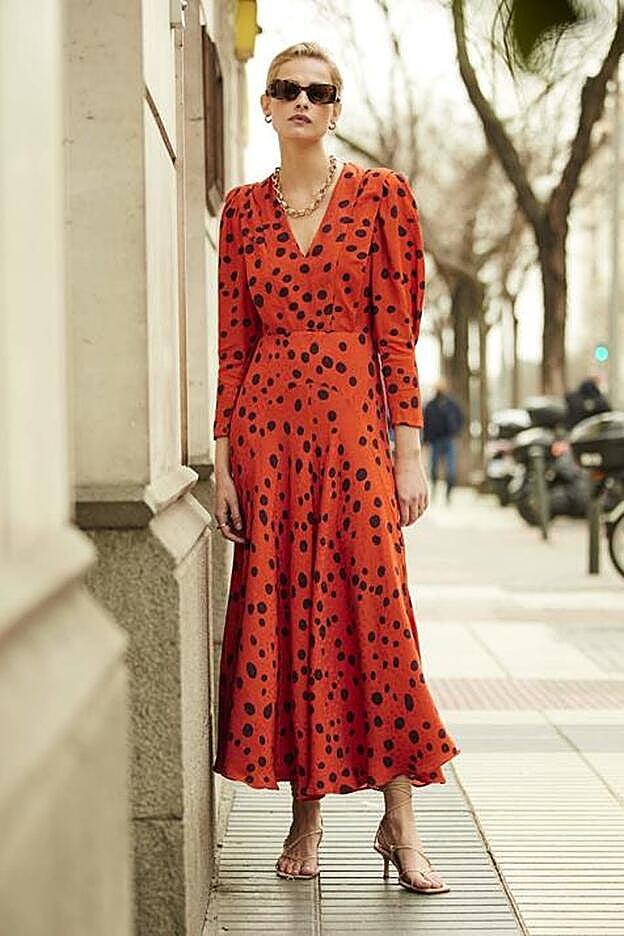 Se trata de un vestido de manga larga con falda de vuelo y escote en pico con un bonito estampado de lunares en color negro sobre un fondo rojo anaranjado. Es un vestido de la firma Color Nude que Lourdes ha vestido en muchas ocasiones y que cuesta 265 euros. Además, es un diseño que tiene una ligera inspiración flamenca, por lo que es una buena opción para celebrar la Feria de abril en estos tiempos de pandemia.