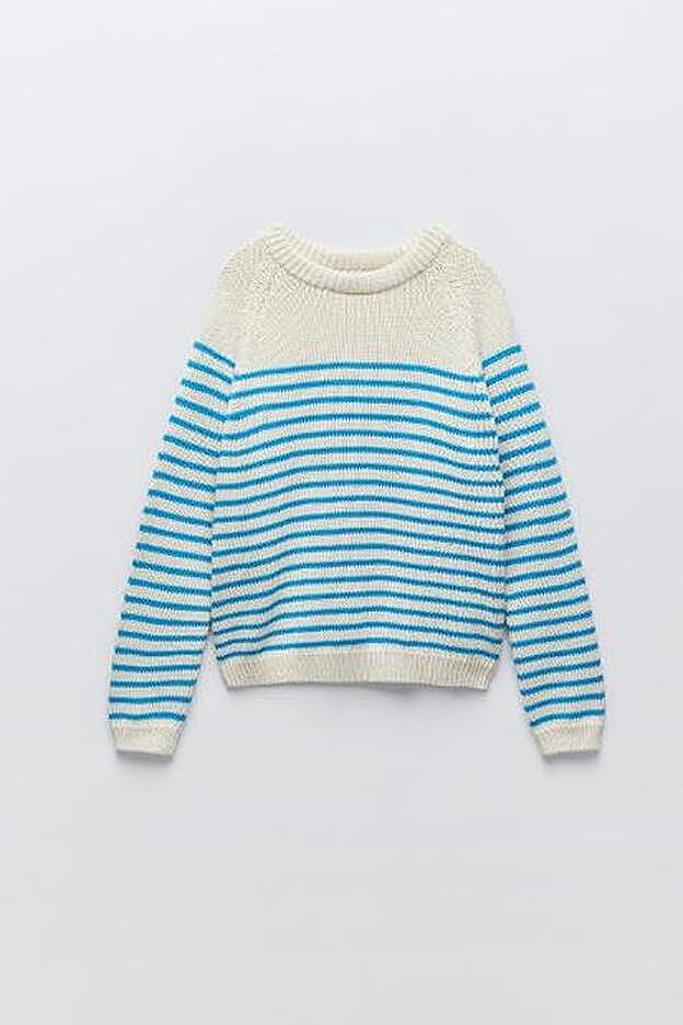 La primera de ella es EL BÁSICO de la temporada, el imprescindible del momento y la tendencia que nunca pasa de moda y que esta primavera ha alcanzado su punto más álgido: un jersey de rayas. Erea se ha hecho con un modelo con finas rayas en color azul sobre un fondo blanco muy primaveral, que tiene el cuello redondo y que cuesta 25,95 euros.