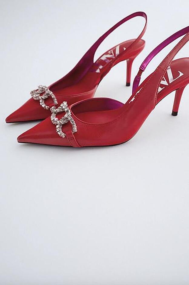 En Zara le han añadido un precioso detalle de eslabones de plata envejecida sobre el empeine, y el resultado no nos puede gustar más. De diseño destalonado, con tira con elástico en la parte trasera, estos zapatos vienen con tacón de siete centímetros forrado y acaban en punta. Tienen un precio de 49,95 euros y están disponibles entre los números 36 y 41.