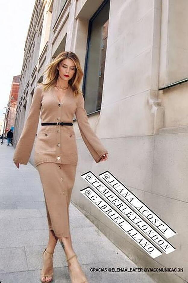 De la mano de su estilista Freddy Alonso, Juana escogió esta vez un look formado por dos piezas a juego en tejido de punto y en un color camel ideal para primavera que pega con todo. Se trata de un conjunto de Temperley London formado por una falda midi súper estilizadora que lleva una chaqueta a juego que es una prenda muy versátil y que podrás utilizar como chaqueta de entretiempo un sinfín de veces.