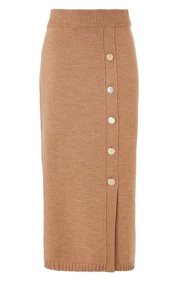 La falda es un modelo de largo midi que queda por debajo de la rodilla y que tiene un diseño de tubo, estrecho y de talle alto que favorece muchísimo. El cárdigan por su parte, es un diseño largo que queda por debajo de la cadera, de manga larga, con bolsillos, escote en pico y botones metalizados.