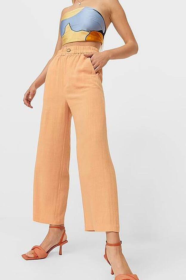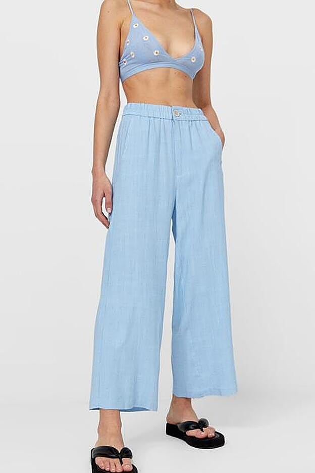 Uno de nuestros favoritos es este pantalón palazzo en color crudo, de tiro alto y diseño fluido. Con cierre frontal de doble botonadura son ideales para llevar con nuestras sandalias más sofisticadas y tienen un precio de 25,99 euros. Están disponibles entre las tallas 34 y 42.