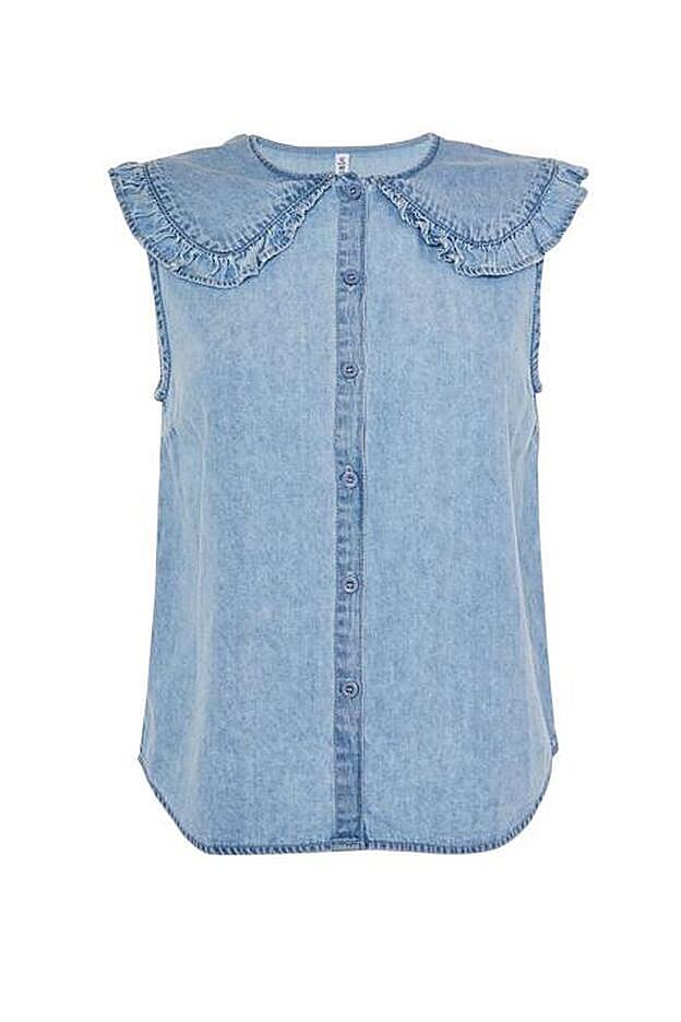 Nuestra primera apuesta va para una camisa con cierre de botones que se sale totalmente del patrón clásico: no lleva mangas y tiene el cuello babydoll con volantes más bonito de la primavera. Un diseño con un azul clarito que va a contrastar fenomenal con nuestro bronceado, pero sobre todo, con cualquier prenda. Podrás llevarla en un total look denim, con blazer, pantalones de traje y mocasines para ir a la oficina con mucho estilo, con bermudas y sneakers, con falda midi y sandalias de tacón... Las posibilidades son infinitas. Todo por 15 euros.