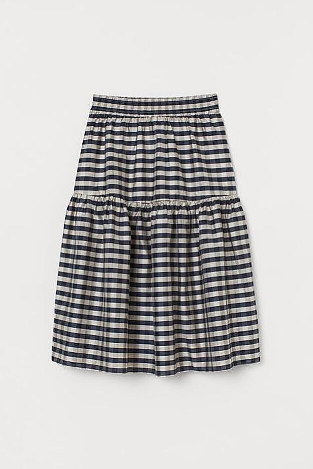 La falda es un modelo de largo midi, de corte fluido y ligeramente acampanado que lleva un volante ancho en el bajo que le da movimiento. Es un diseño de talle alto que nos ha encantado especialmente porque lleva el que es ya el estampado tenencia de la temporada: los cuadros vichy. En color blanco y negro, esta falda lleva un elástico en la cintura que hace que se adapte a la perfección a la figura y cuesta 29,99 euros.