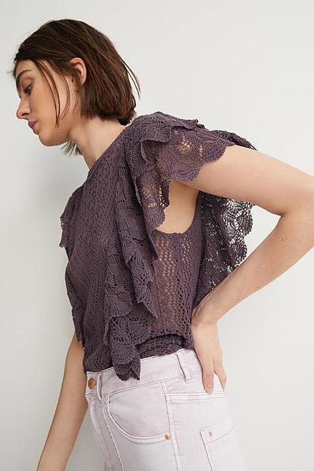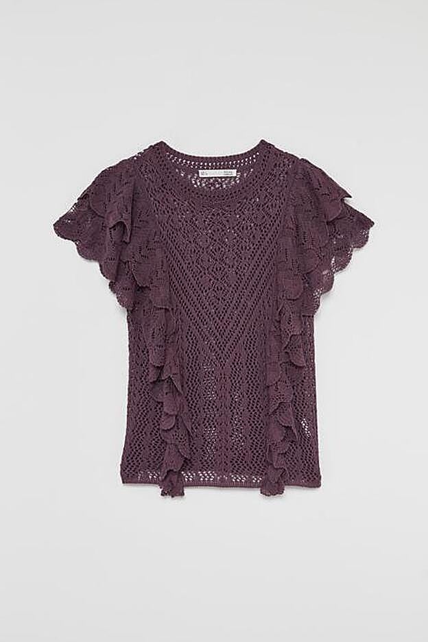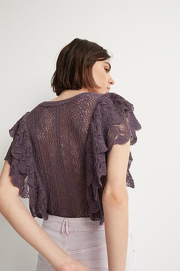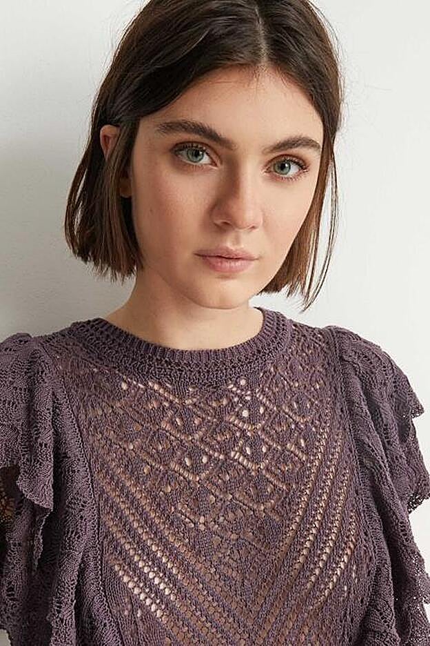 En color ciruela, con diseño de volantes dobles en los laterales y confeccionado en punto calado, este bonito jersey de Sfera es perfecto para las tardes primaverales.