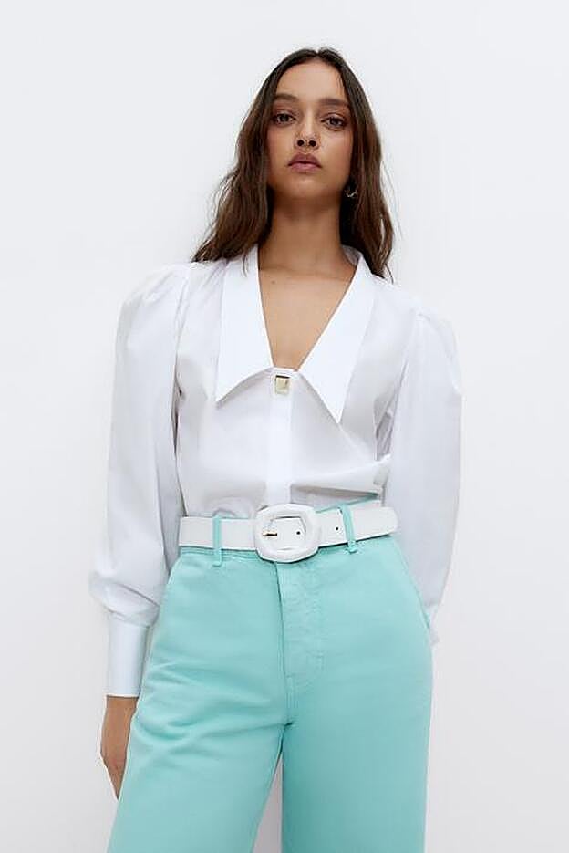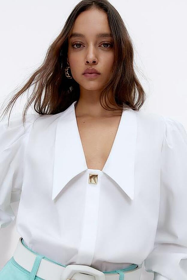 La última, aunque no menos importante, es esta camisa blanca confeccionada en popelín, con cuello en pico y cierre de botón dorado en el frontal, seguido de otros a tono.