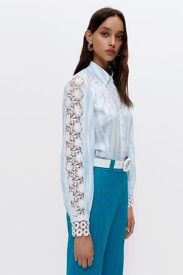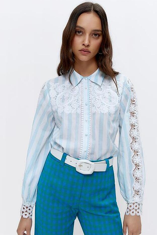 Otra propuesta ideal para combinar con shorts y pantalones en color blanco o azul es esta camisa de algodón con estampado de rayas verticales en esos tonos y apliques de guipur en las mangas.