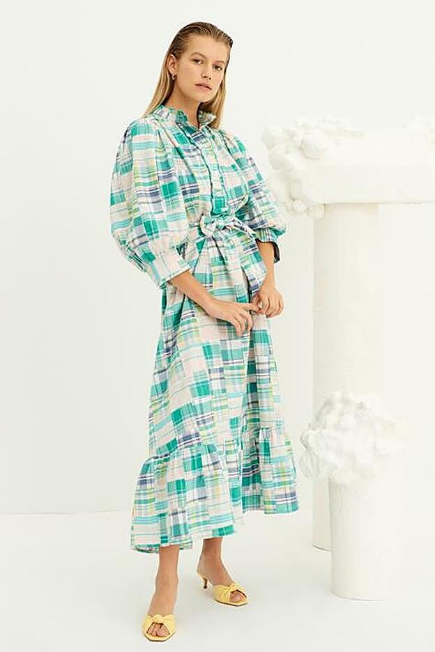 Y todo se debe a un vestido camisero de Antik Batik de lo más original. Se trata de un modelo de largo midi con un estampado de patchwork en tonos verdes y que tiene un diseño de medias mangas abullonadas, cuello subido, cinturón a juego para definir la silueta y un volante ancho en el bajo que le da movimiento y volumen a la falda.