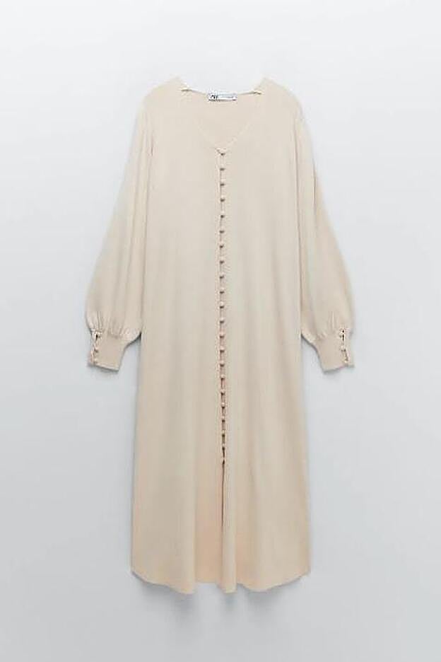 Se trata de un vestido de punto fino de edición limitada de Zara que lleva el escote en pico y la manga larga y está protagonizado por un color beige claro. Cuesta 59,95 euros y lo mejor que tiene es un original cierre de botones forrados que recorren toda la prenda que es de largo midi. ¿La mala noticia? Que está agotado en sus tres tallas. Eso sí, es un vestido de temporada por lo que hay posibilidades de encontrarlo en tienda. ¡Prueba suerte!