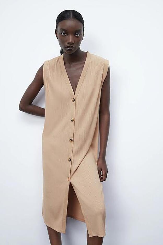 Esta prenda de Zara es un dos en uno, un lienzo en blanco que podrás lucir en solitario o entrelazar con otras opciones de tu armario y con todo tipo de complementos. Se trata de un vestido midi tipo chaleco con escote a pico, mangas sisa y cierre de botones delanteros a contraste. Un diseño con el que se nos ocurren más de cinco estilismos diferentes para cualquier ocasión.