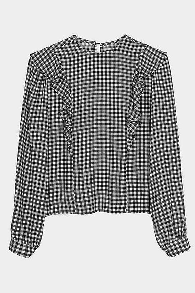 La blusa es un modelo de manga larga y cuello redondo que tiene unos bonitos volantes en el hombro que le dan cuerpo y un toque muy sofisticado. Cuesta 45 euros, está disponible desde la talla XXS a la M y tiene como protagonista los exitosos cuadros vichy en color blanco y negro.