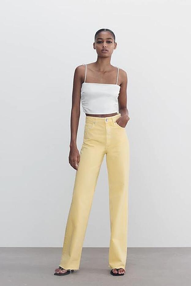 Pero si lo que quieres es llevar el amarillo a toda costa e incluir unos pantalones este color tendencia en tu armario de primavera y verano, en Zara hay otra opción con un corte similar pero con muy pocas tallas disponibles. Son los jeans Wide Leg Full Lenght Color, otro de los más vendidos de Zara: unos pantalones más rectos que los anteriores pero con la pernera ancha en la misma linea. También cuestan 29,95 euros y solo están disponibles en las tallas 36, 38 y 40. ¡No te lo pienses dos veces!