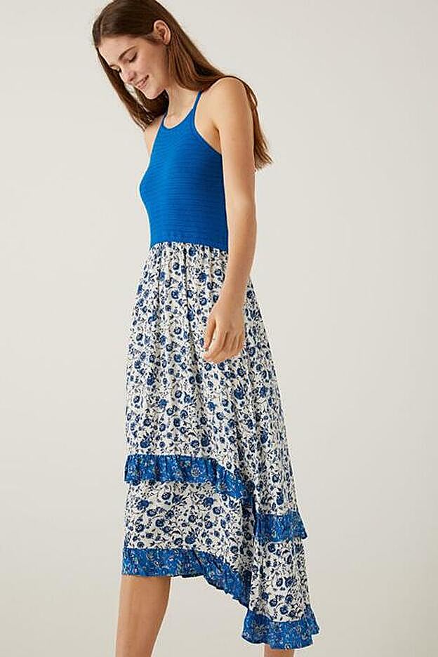 Hablamos de un vestido que simula una falda con un top. Y es que el cuerpo en color azul fuerte es de tirantes con cruce en la esplada y está confeccionado en un bonito crochet. Por otro lado está la falda, protagonizada por un estampado floral de colores sobre fondo blanco, el bajo asimétrico y un tejido fluido que le da movimiento a la prenda.