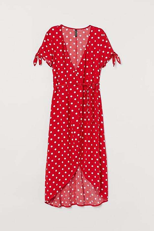 Si te decantas por una versión más veraniega pero con el mismo estilo y elegancia, este modelo de H&M está confeccionado en tejido arrugado con escote de pico, frente cruzado con tiras de anudar en la cintura y mangas cortas con abertura y lazada. No tiene forro y es largo hasta las pantorrillas. Tiene un precio de 24,99 euros.