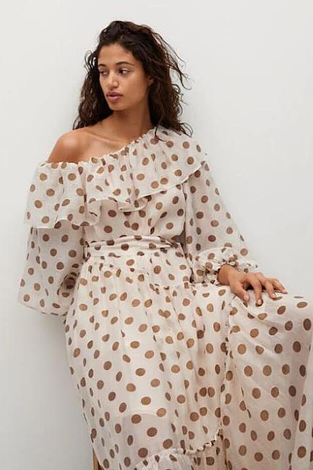 Se trata de un modelo de lunares en color marrón sobre un fondo blanco y en un diseño largo, de tejido vaporoso, escote asimétrico, mangas abullonadas y cinturón ajustable que define la cintura. Cuesta 59,99 euros y pertenece a la colección Committed, es decir, productos que han sido confeccionadas con fibras y/o procesos de producción sostenible, reduciendo así su impacto ambiental.