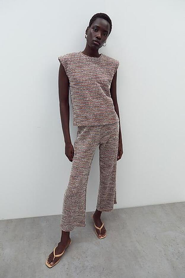 La parte de arriba es un chaleco que no puede ser más tendencia. Es de punto multicolor, lleva unas hombreras para dar más volumen y cuerpo, tiene un cuello caja y se puede combinar en solitario, como ha hecho Amelia, o sobre una camisa blanca para los días más fríos. Cuesta 17,99 euros y ya está agotado en las tallas S y M, aunque con posibilidad de conseguirlo aún en la L y en la XL