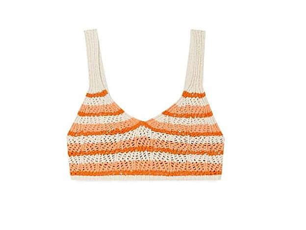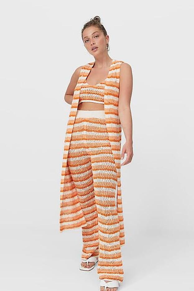 Hablamos de un set de tres piezas que se venden por separado y que tiene como protagonista un bonito tejido de crochet con estampado de rayas en color naranja y blanco. Este conjunto está formado por unos pantalones de talle alto y de corte 'flare' (29,99 euros) que parecen ser de lo más cómodos y que también puedes usar con una camiseta blanca y zapatillas para un look casual y todoterreno.