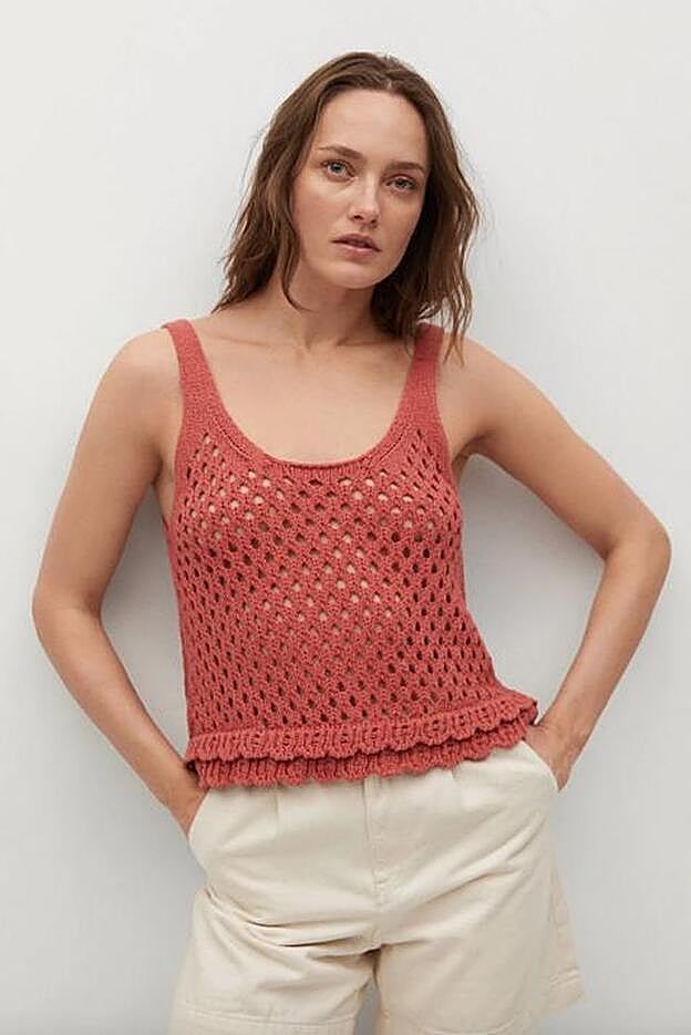 Uno de nuestros favoritos es este top crochet en naranja tostado con tejido de crochet en punto calado, de diseño cropped. Con escote redondo, tirantes medios y volantes en el bajo, tiene un precio de 19,99 euros y está disponible entre las tallas XS y XL y en color beige.