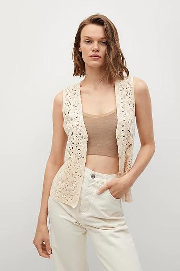 Para la parte de arriba, la influencer ha elegido un chaleco crochet de Mango en color crudo que nos recuerda a la ropa de ganchillo que nos hacían nuestras abuelas y que podrás compartir con tu madre o con tu hija porque sienta igual de bien a los 20 que a los 50. Su tejido es de algodón, tiene un diseño recto con el cuello a pico y cierre de botones en la parte delantera. Se puede llevar abierto o cerrado, sin nada o con blusa o camiseta debajado, y con todo tipo de pantalones y vaqueros. Cuesta 29,99 euros y está disponible en todas las tallas de la XS a la XL.