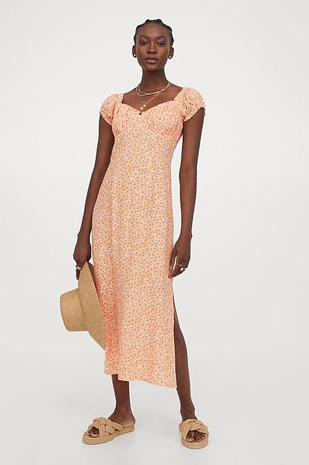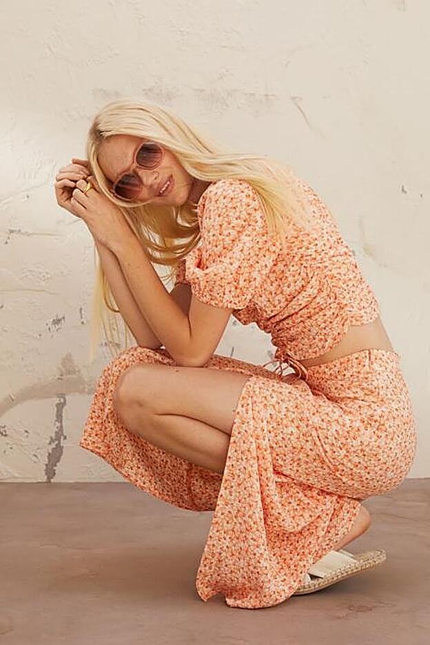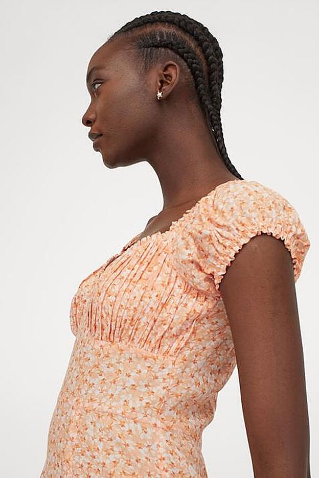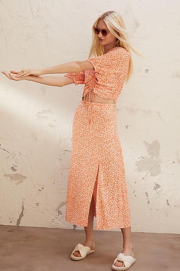 La firma responsable de este flechazo floral ha sido H&M, que en su última colección ha incluido un vestido, una falda y una blusa que apuestan por el estampado tendencia del momento en naranja pastel y blanco, unos tonos súper apetecibles para ponérselos toda la temporada. Además de que dos de las prendas se pueden combinar para apostar por un look irresistible, el vestido es igual de apetecible, porque además de ser bonito sienta de maravilla.