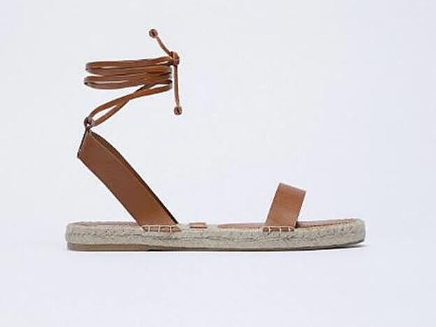 Al igual que las alpargatas, el calzado con detalles de yute o esparto es uno de los favoritos del momento. En Zara puedes encontrar estas sandalias planas con punta cuadrada y tiras de piel en color marrón que van anudadas a la pierna por 15,99 euros.