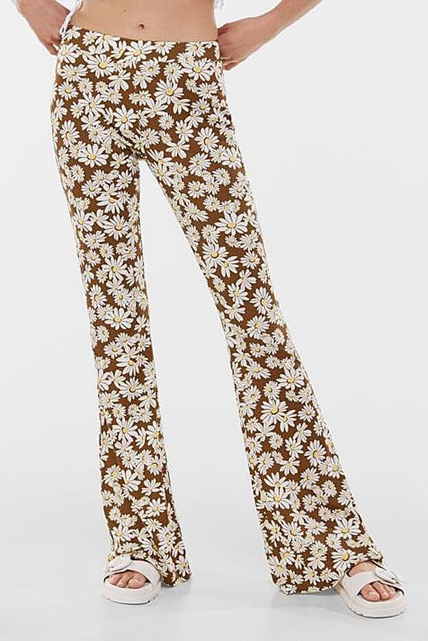 Cuestan 22,99 euros y nos encantan por su bajo acampanado que tan bien sienta y tanto favorece. Además, solo tendrás que añadirle tus zapatillas blancas para triunfar. Y no es el único modelo, Bershka ha apostado fuerte por este diseño y ha traído varios diseños parecidos. En este caso, es un modelo con el mismo estampado pero sobre un fondo marrón chocolate, para las que prefieren prendas más oscuras.